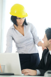 Engineers having discussion about new business project using lap